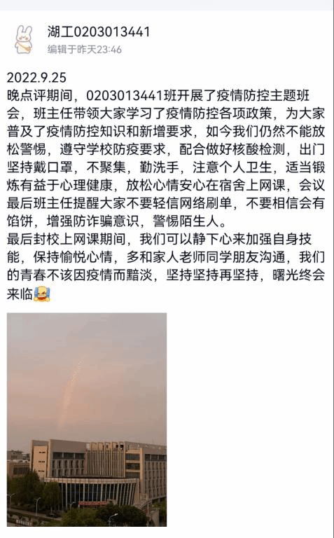 伴随着25日傍晚美丽的夕阳余晖,best365官网全体班级开展了疫情防控政策学习的主题班会。