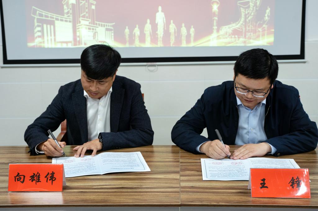 集团教育发展基金会秘书长谢彬与向雄伟签订捐赠协议。经理王锋和向雄伟签订实习基地协议。
