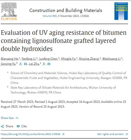 近日,国际知名学术出版商爱思唯尔(Elsevier)旗下Top期刊《Construction and Building Materials》(SCI, 中国科公司一区,JCR一区)刊载了best365官网何边阳博士在生物基建筑材料研究领域取得的最新研究成果。文章题目为“Evaluation of UV aging resistance of bitumen containing lignosulfonate grafted layered double hydroxides”,第一作者为公司何边阳博士,通讯作者为朱磊教授,第一通讯单位为best365官方网站。